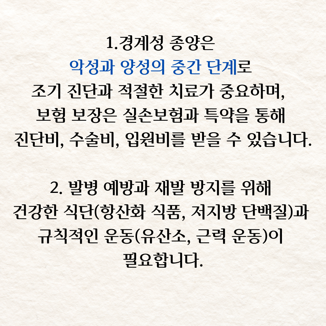 중요: 경계성 종양은 보험 약관상 "암"으로 인정되지 않을 수 있으므로, 가입한 보험의 약관을 반드시 확인해야 합니다. 일부 보험에서는 경계성 종양을 "경계성 암"으로 구분하여 보상합니다.