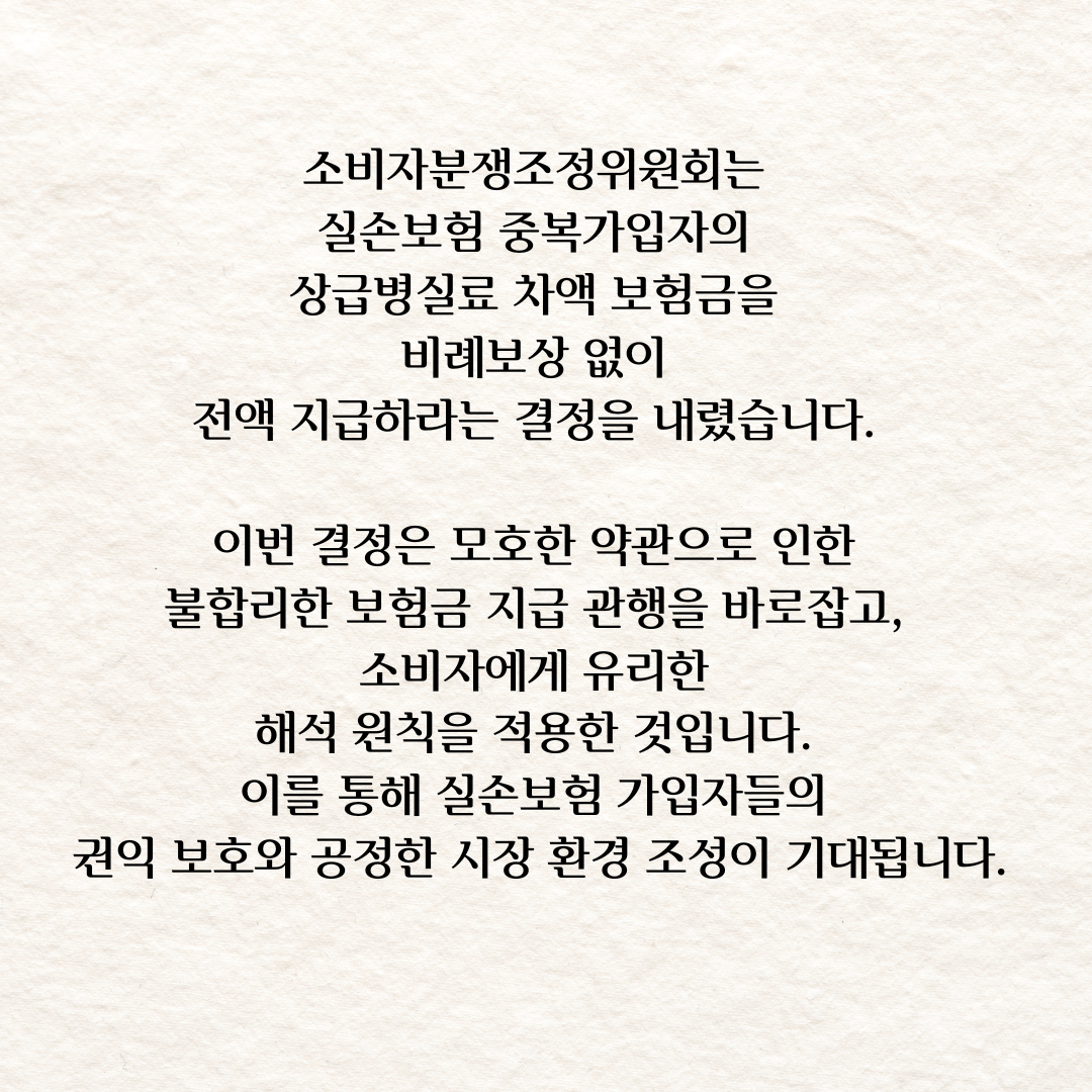 이번 사례는 실손보험의 공정한 보험금 지급이 얼마나 중요한지 보여주는 대표적인 예입니다. 실손보험 중복가입자라면, 자신이 받을 권리가 있는 보험금을 제대로 이해하고 받아야 합니다!