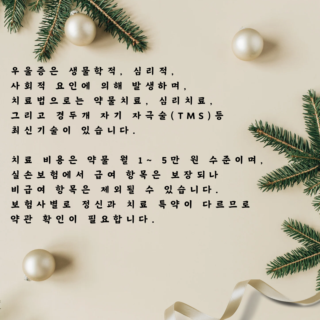 "우울증은 다양한 요인에 의해 발생하는 복합적인 정신 건강 문제로, 그 원인과 치료법은 개인에 따라 다를 수 있습니다. 이번 글에서는 우울증의 주요 원인 분류, 일반적인 치료법, 최신 치료 기술, 치료 비용, 그리고 실손보험 적용 여부에 대해 상세히 알아보겠습니다."