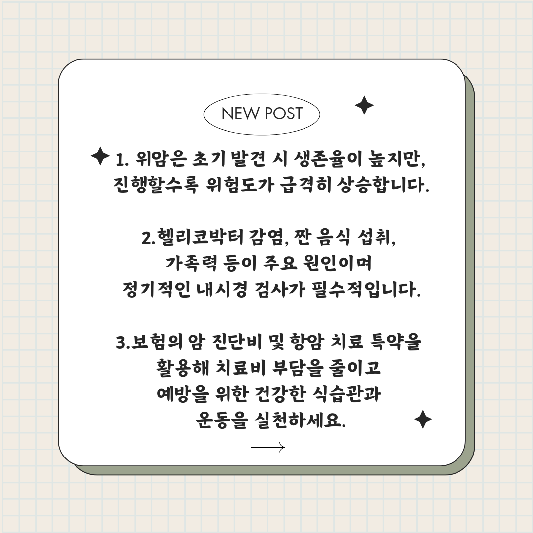 위암은 조기에 발견하면 높은 생존율을 보이는 질환입니다. 원인을 알고, 예방을 위한 생활습관을 실천하며, 필요한 경우 보험의 도움을 받을 수 있도록 준비하세요. "내일의 벽돌 쌓기"로 한 걸음씩 건강한 내일을 만들어가세요.