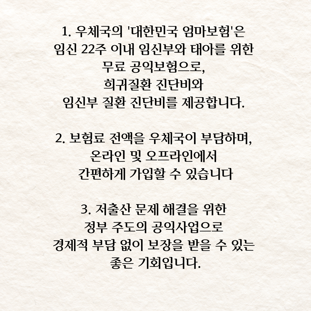 ▪︎임신부와 태아를 위한 든든한 지원책인 우체국의 무료 태아보험을 통해 건강하고 안전한 출산을 준비하시기 바랍니다.