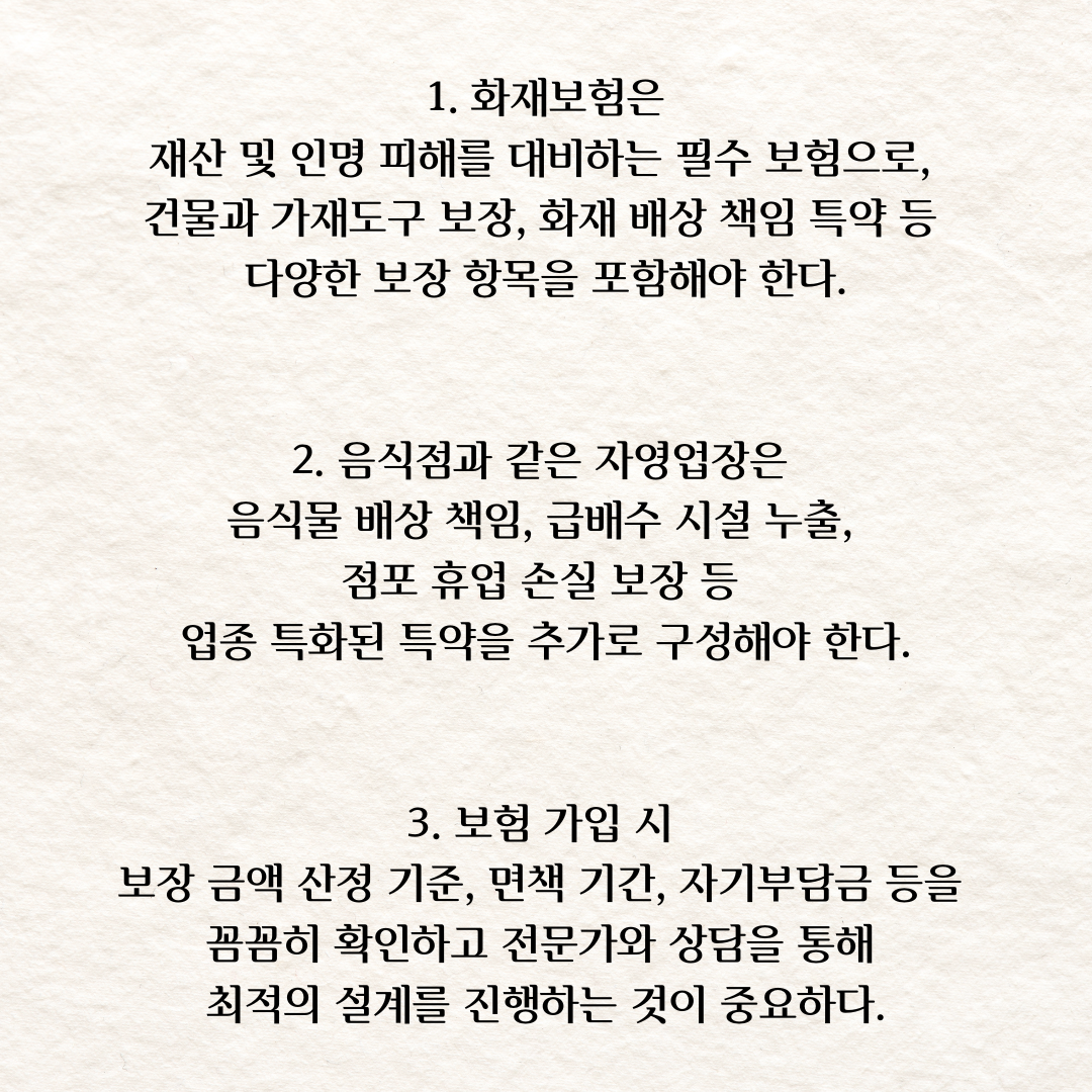참고: 현재 운영 중인 영업장의 화재보험 구성과 보험료가 적절한지 전문가와 상담을 통해 확인하는 것을 권장드립니다.