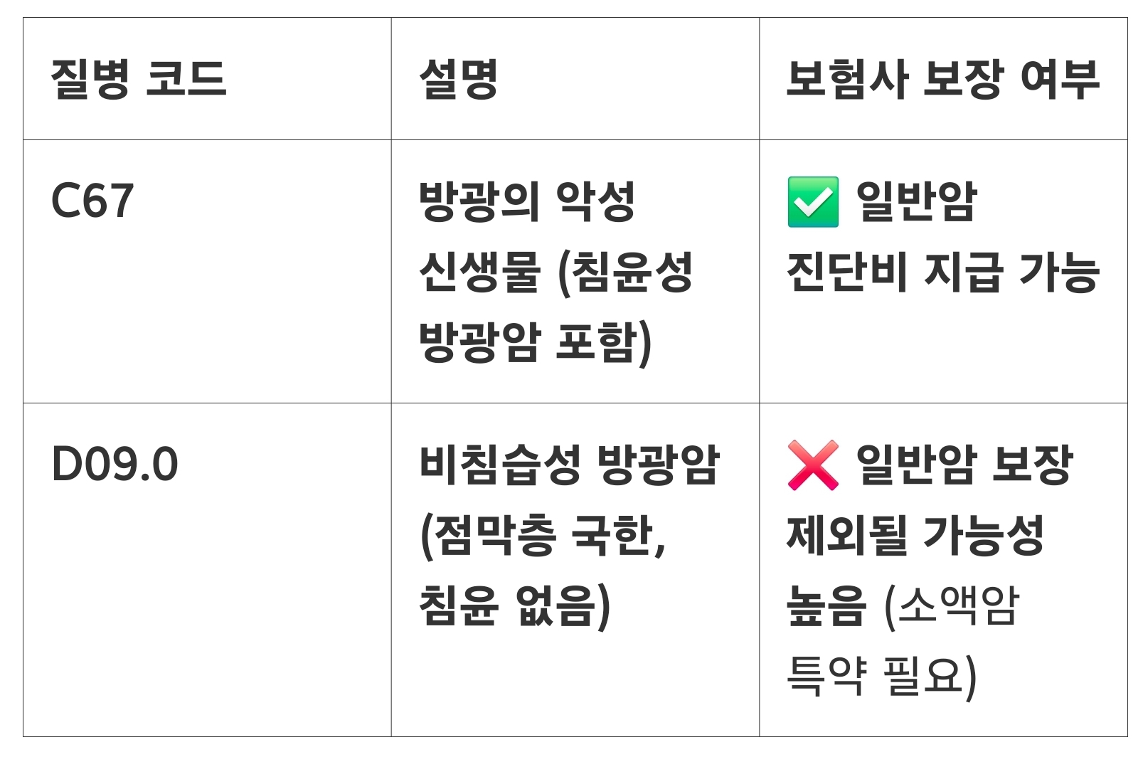 ✅ 특히 C67(악성 신생물)과 D09.0(비침습성 방광암) 코드의 차이를 모르면, 암 진단비 지급을 거절당할 수 있습니다.